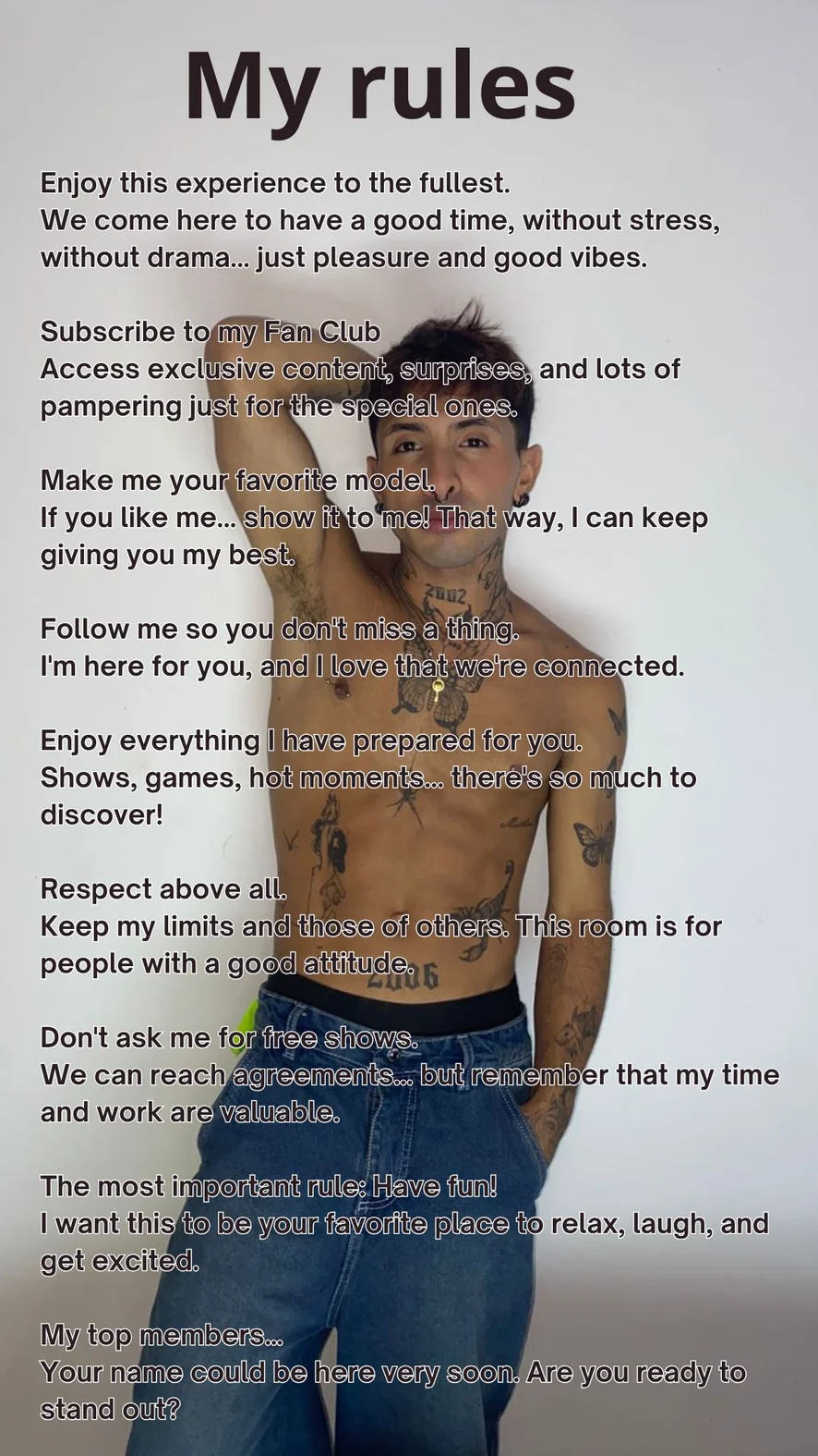 I consider myself a person with overwhelming confidence,☺️ with a daring touch and a captivating energy.😏 My presence and the way I express myself always have a seductive and passionate air,🫣 making everyone feel attracted to my authenticity.🥵